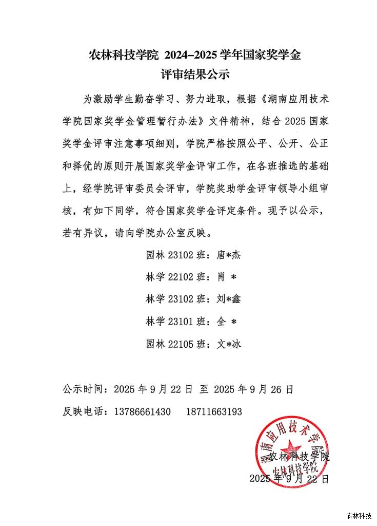 农林科技学院 2024-2025学年国家奖学金评审结果公示