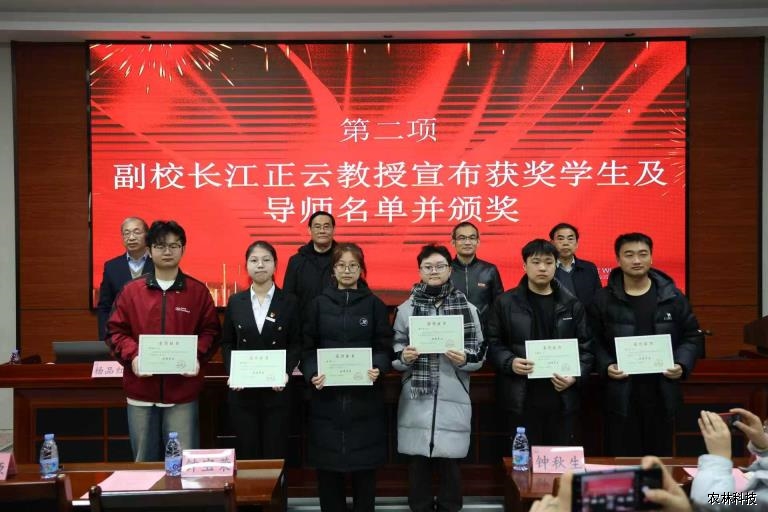 会议由陈梦稀处长主持,会上农林科技学院院长兼“菁英计划”班主任杨品红教授总结了“双新菁英计划”实施一年半以来取得的阶段性成果和未来发展方向,并对部分优秀学员事迹进行了通报。江正云副校长宣读获评“双新菁英计划”优秀学生和指导老师名单并颁发证书。李旋旗校长做重要讲话,充分肯定了“双新菁英计划”的办班以来取得的成绩,向获奖师生致以热烈祝贺,并围绕未来培养方向提出四点期望:一要勇于打破认知边界,深化跨学科交叉融合;二要善用人工智能技术,赋能创新学习与研究;三要坚持知行合一,将个人成长融入国家与区域发展大局;四要涵养教育家精神与卓越品格,立志成为担当民族复兴大任的时代新人。他勉励全体学员珍惜平台,以此次表彰为新的起点,志存高远、脚踏实地,在创新实践中实现价值。学校将持续优化支持体系,为拔尖创新人才的成长提供更优环境。此次大会既是对前期工作的总结与肯定,更是推动该计划持续深化、提质增效的新起点!